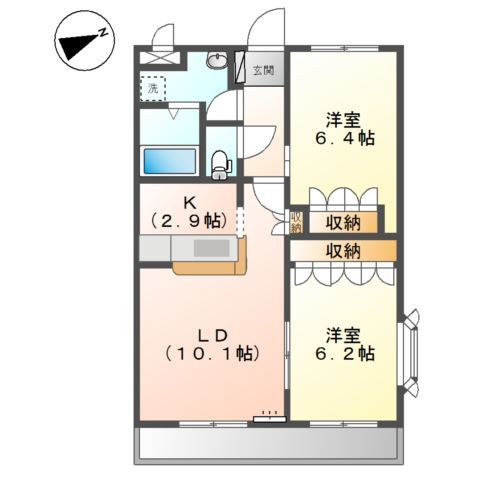 LDK 13.0帖 1室/洋室 6.4帖 1室/洋室 6.2帖 1室 - 向き